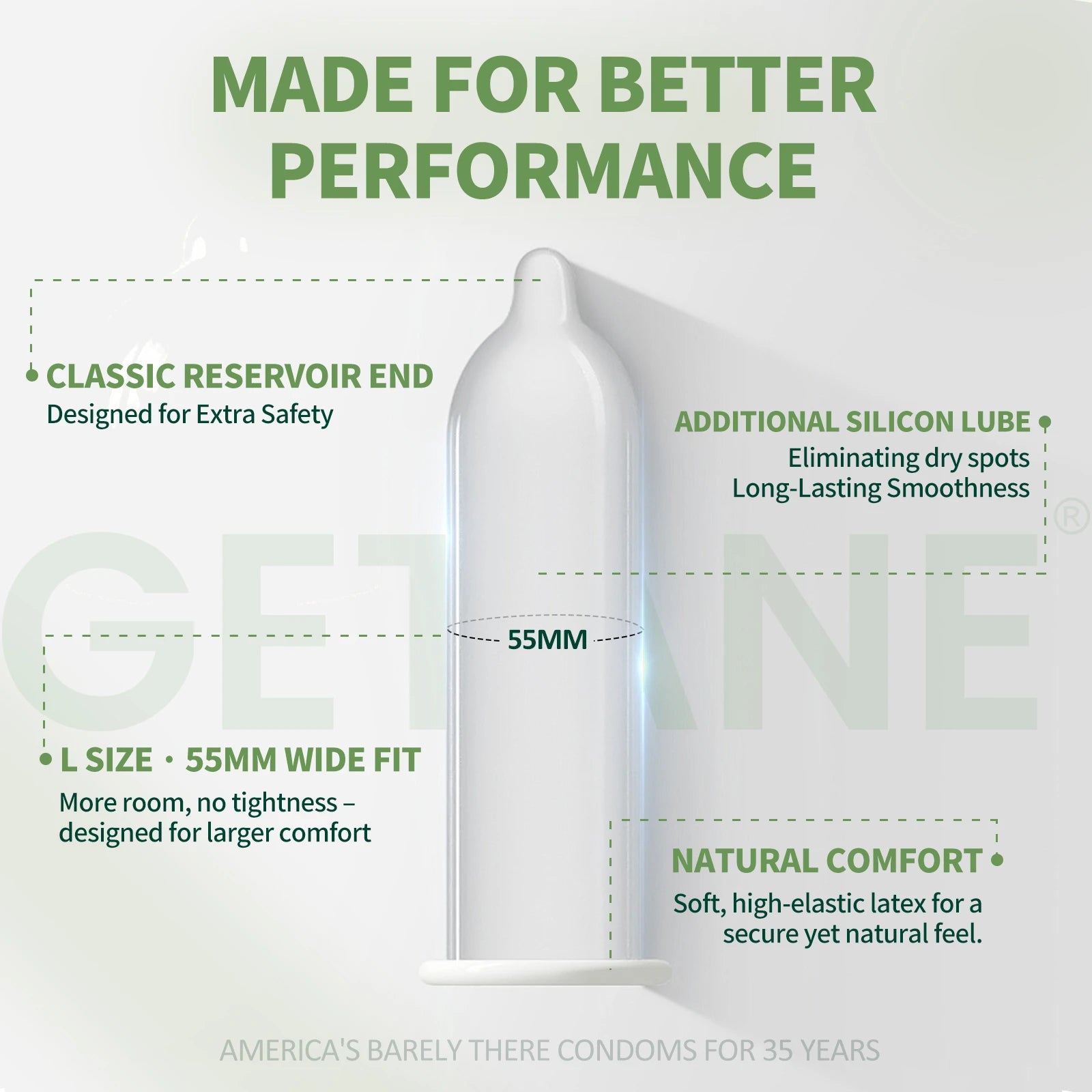 GETANE Large Size Condoms are designed for men who need more room without sacrificing comfort. With a true 55mm wide fit, extra space, and long-lasting lubrication, this value pack delivers performance and protection in every moment.